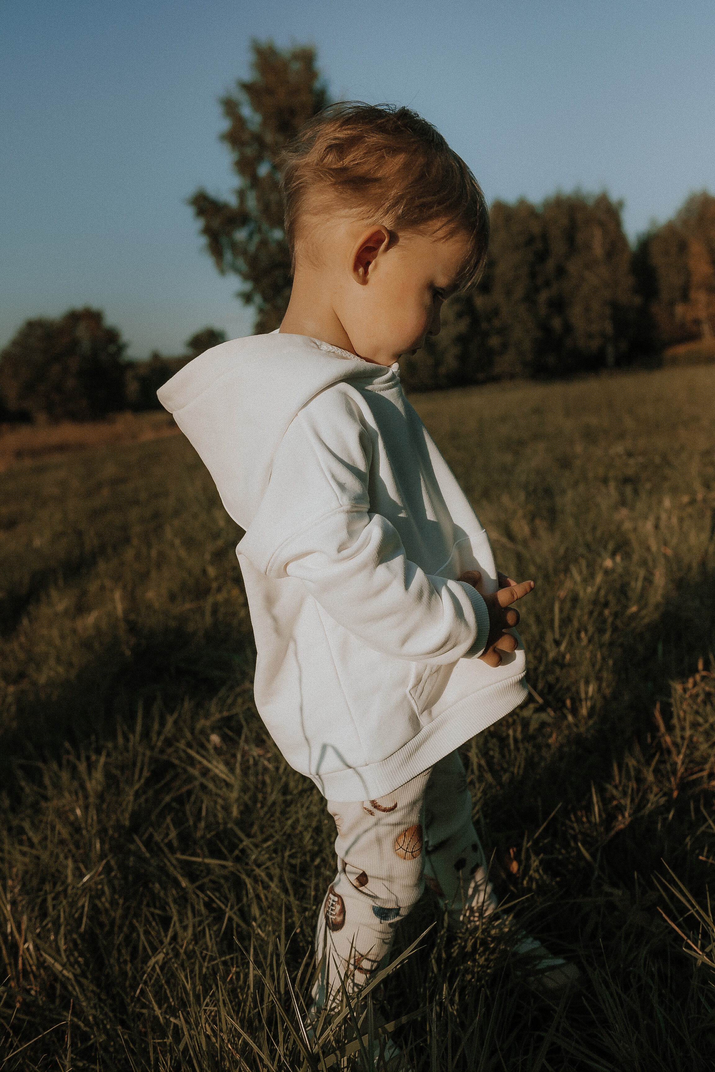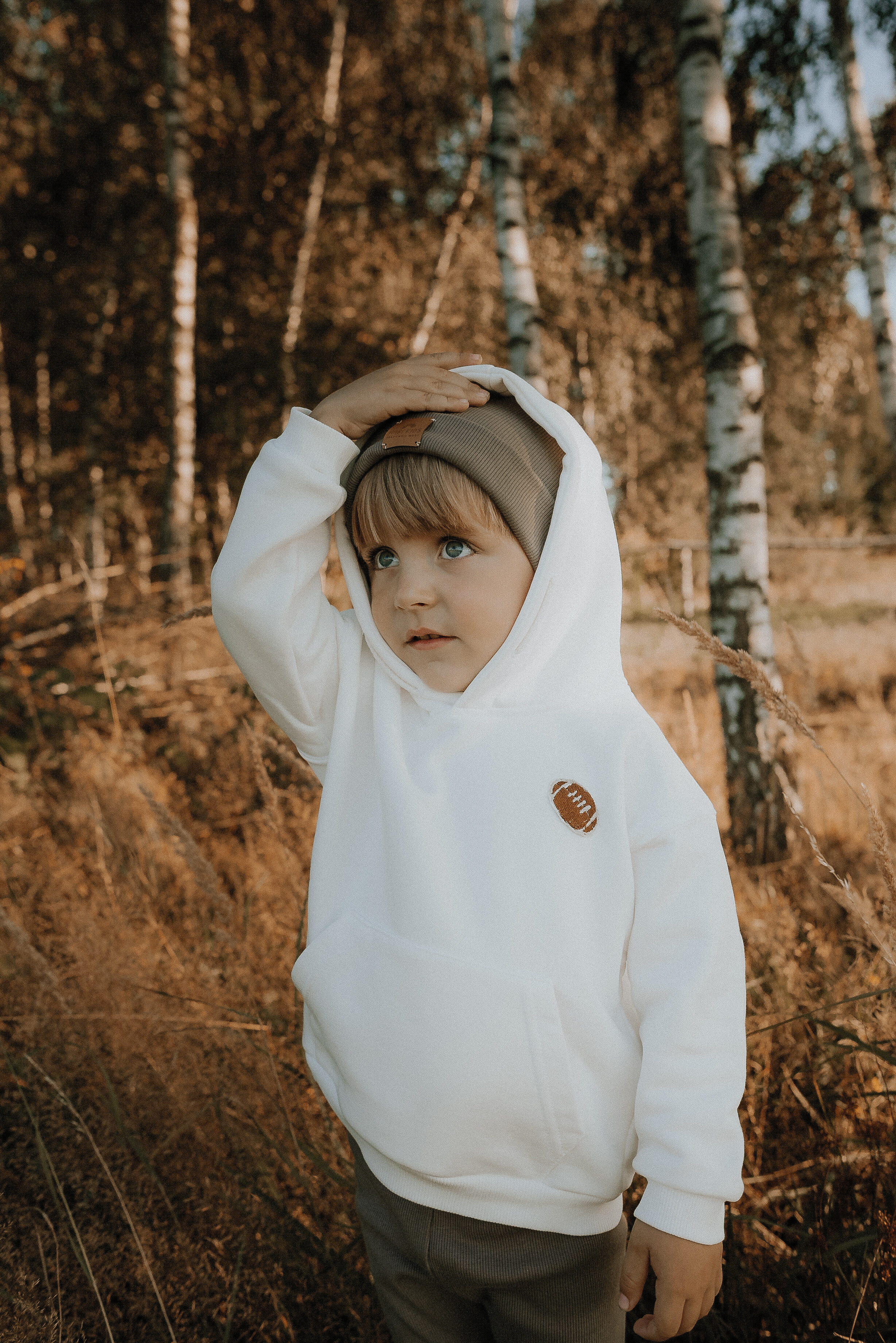 Bluza dresowa z kapturem i haftem piłki futbolowej. Wykończona ściągaczami. Kieszeń typu kangur.