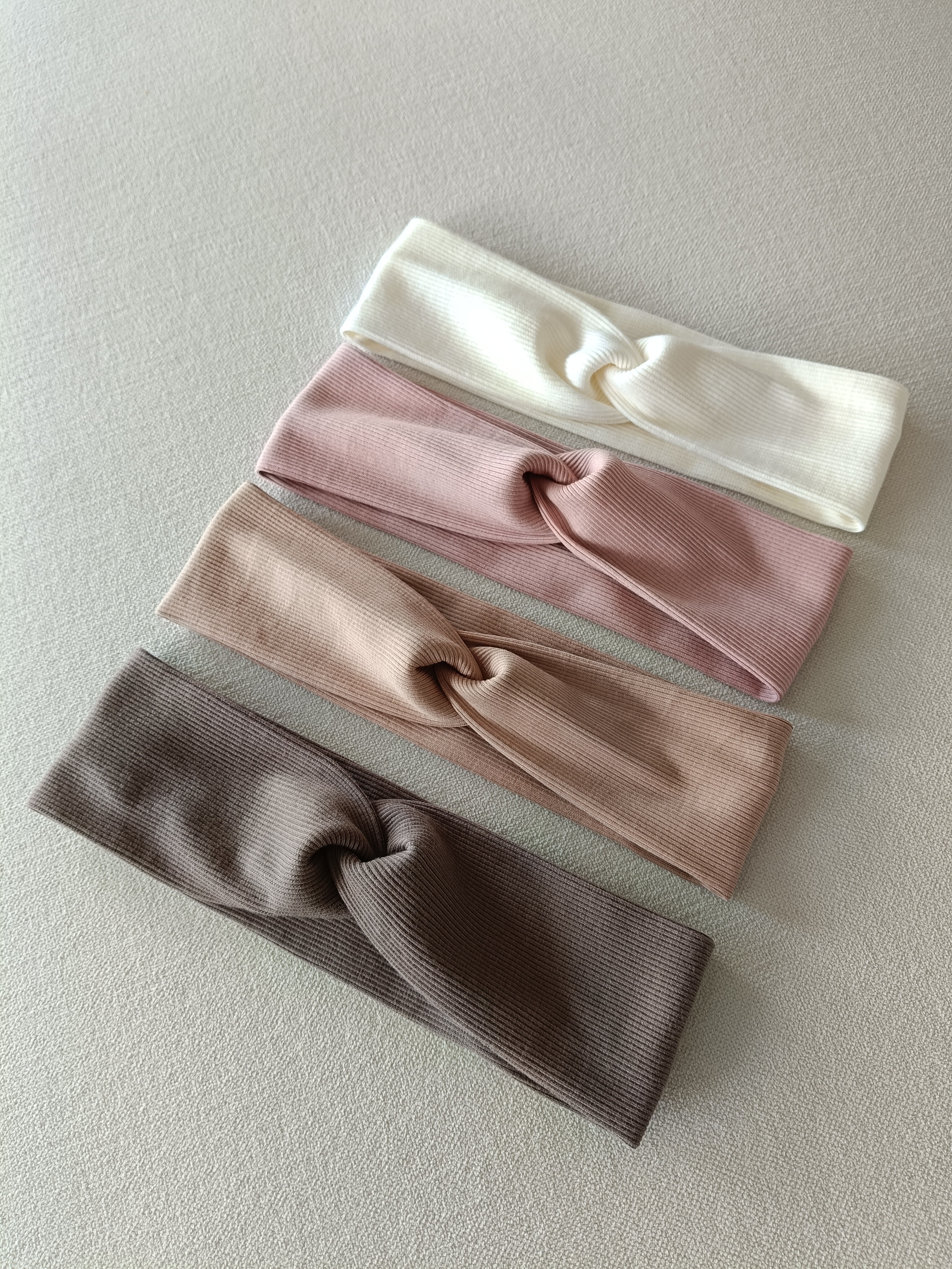 Dziecięce opaski na głowę. Produkt dostępny w 4 kolorach: krem, brudny róż, jasny beż i czekolada.