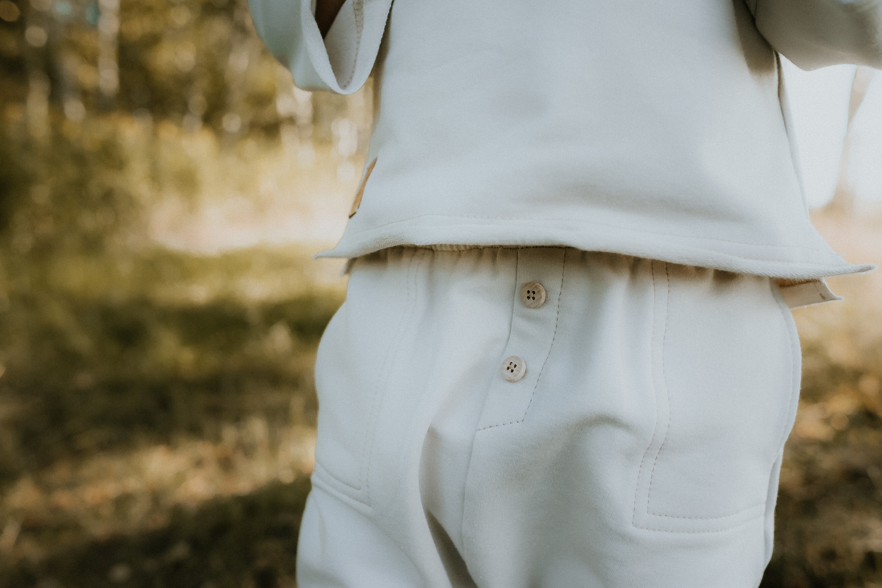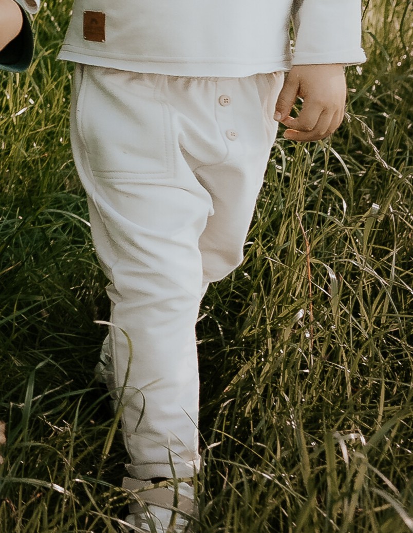 Spodnie typu baggy z ozdobnymi przeszyciami i drewnianymi guzikami.